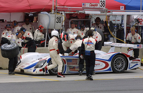 The R8 crew hustles during pitstop practice after the raceday warmup